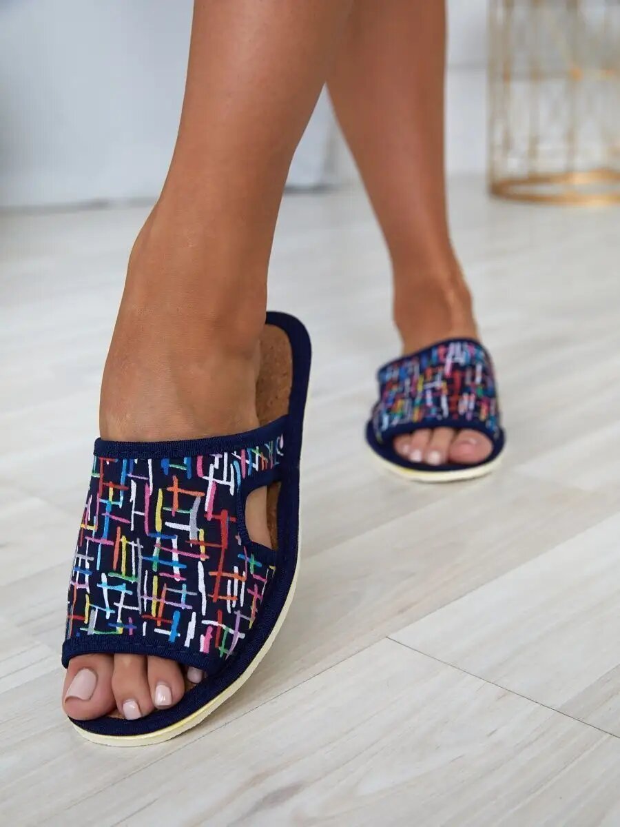 Женские домашние тапочки "LepiloV", открытые, на пробковой стельке. Размер 40. Синие, горох с цветами. 500 ₽