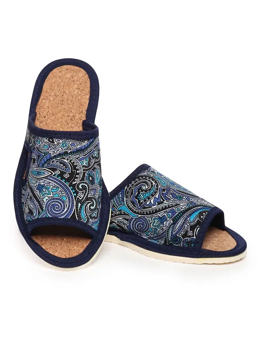 Женские домашние тапочки "LepiloV", открытые, на пробковой стельке. Размер 40. Синие, горох с цветами. 500 ₽