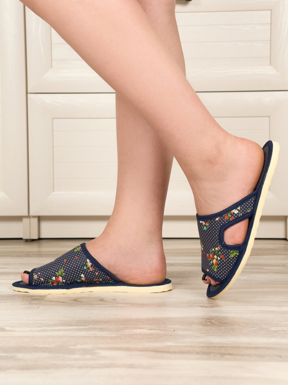 Отзывы на Женские домашние тапочки "LepiloV", открытые, на текстильной стельке. Размер 42. Синие, горох с цветами.