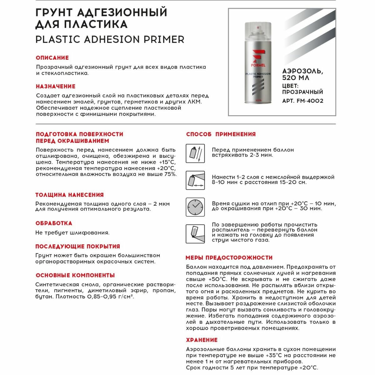 Грунтовка По Пластмассе 520 Мл Прозрачная Адгезионная FORMEL арт. FM4002 информация: