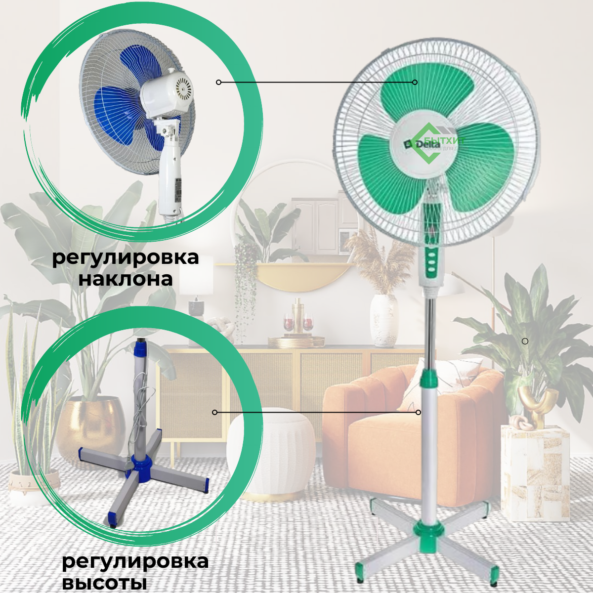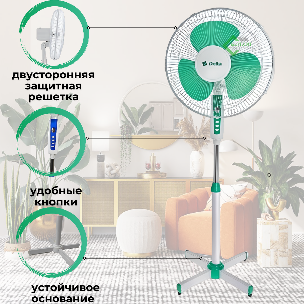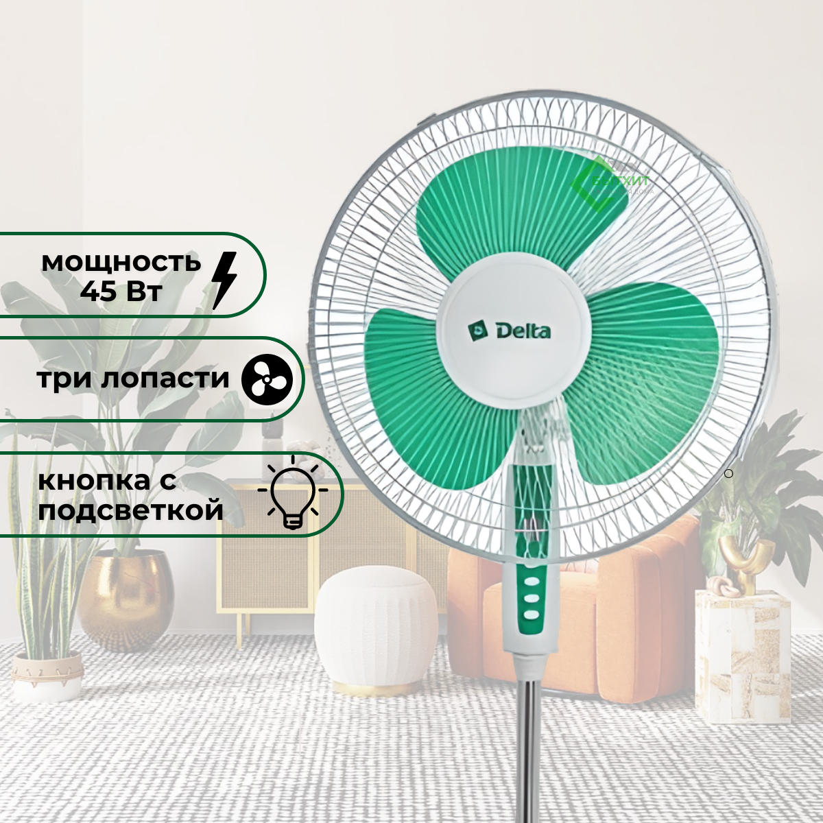 Вентилятор DELTA 003N напольный 45Вт, диаметр 40см, 3 скорости, белый с зеленым информация:
