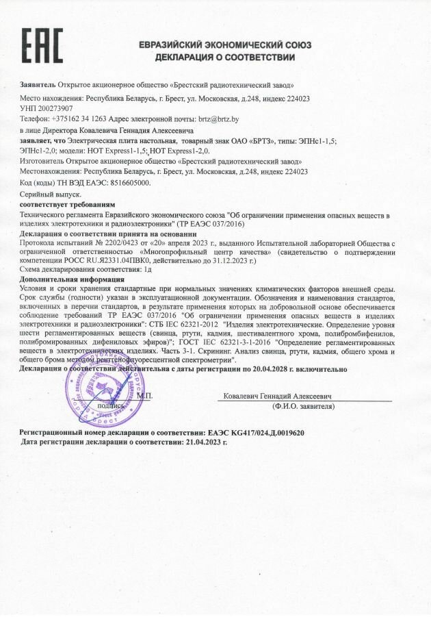 Электроплитка Бртз HOT Express ЭПНс1-2,0 . информация: