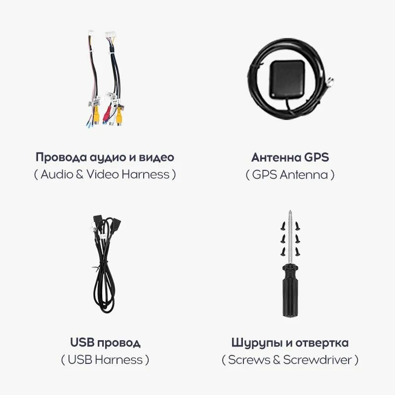 | Подробная комплектация | Магнитола10 дюймов, провода аудио-видео, антенна 4G, антенна GPS, USB провод, шурупы и отвертка, упаковка, схема подключения проводов, электронная инструкция |