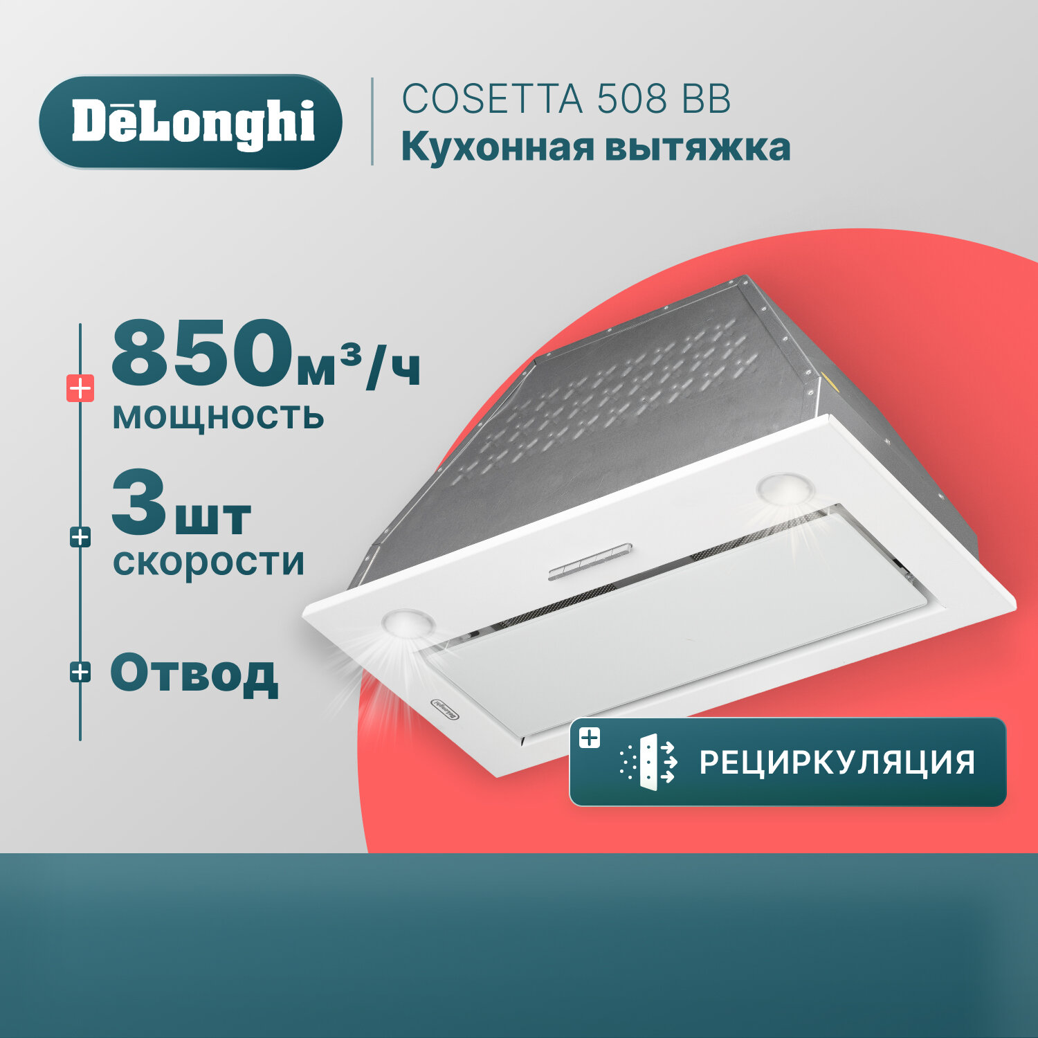 Вытяжка для кухни 52 см DeLonghi COSETTA 508 BB, белая, 3 скорости, 850 м3/ч, вытяжка кухонная встраиваемая информация: