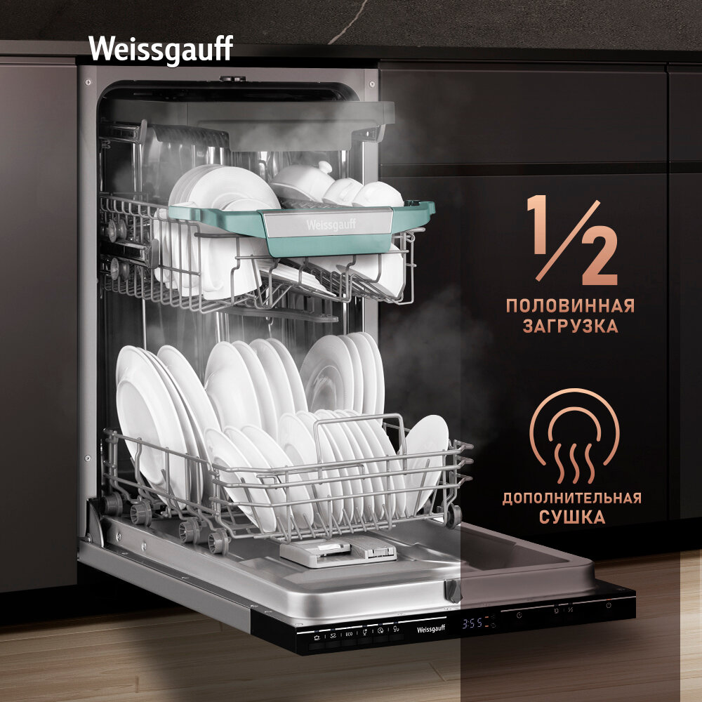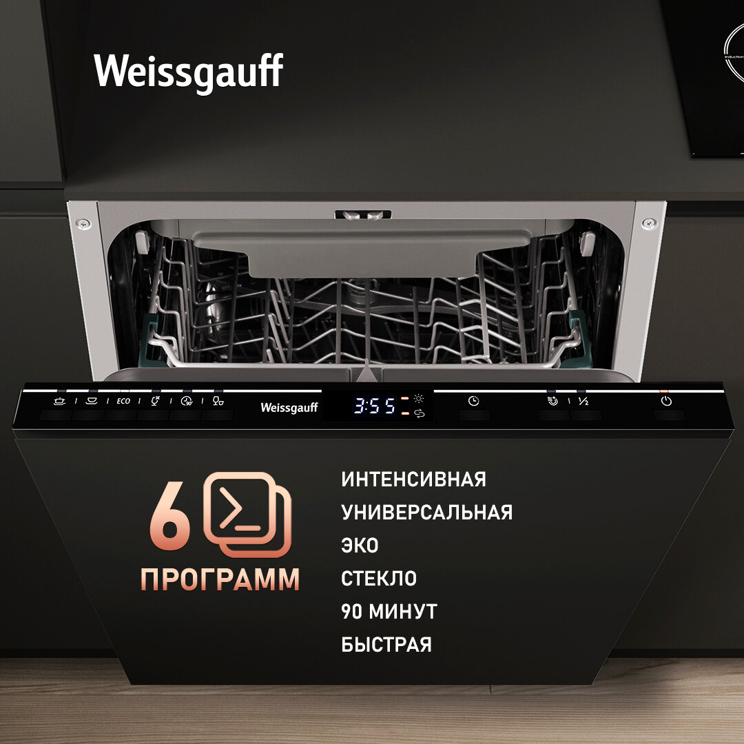 Встраиваемая посудомоечная машина Weissgauff BDW 4536 D, З корзины, дисплей, таймер информация: