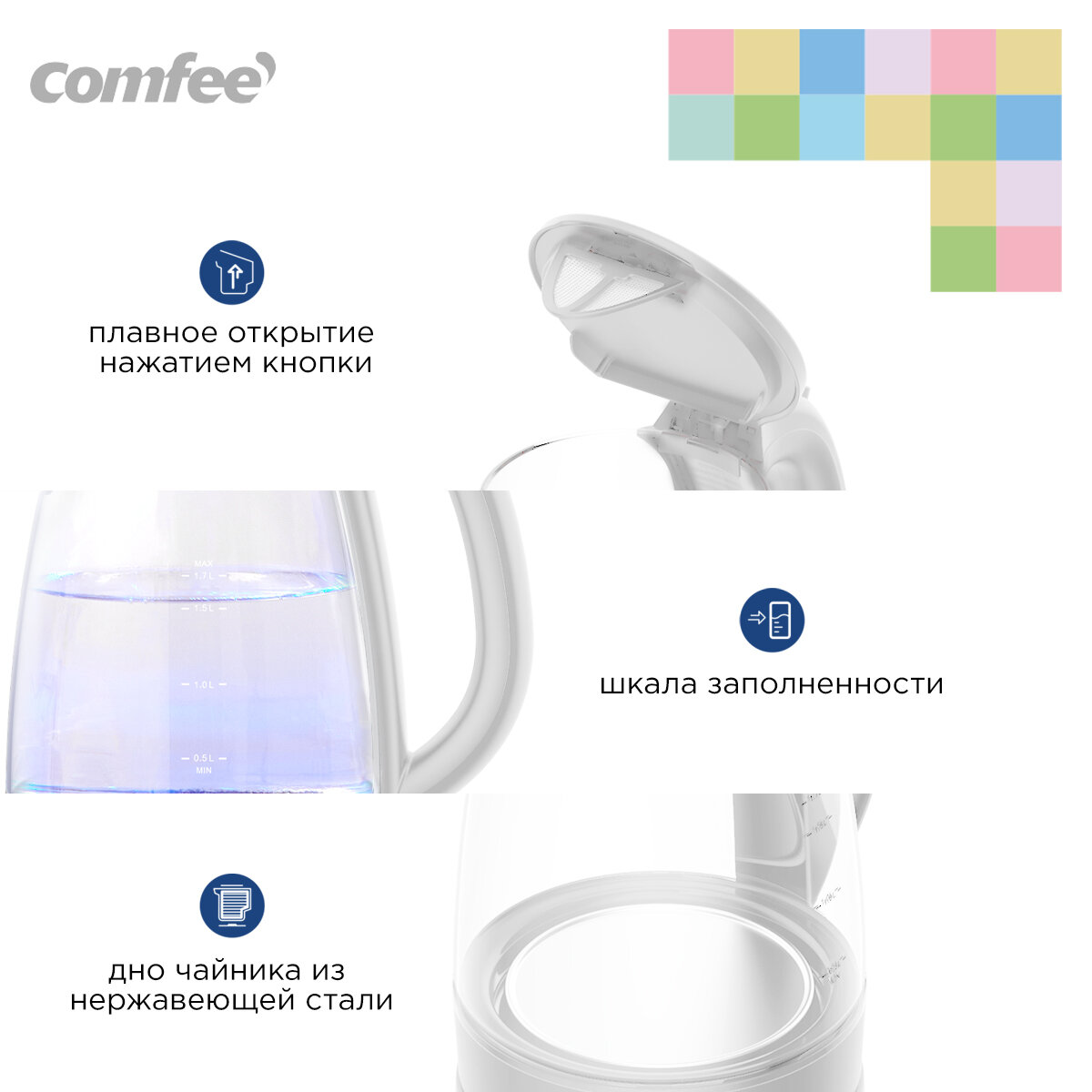 Отзывы на Чайник электрический Comfee CF-KT7001, 1.7 л, 2200 Вт, LED подсветка, автоотключение, съемный фильтр, вращение корпуса 360, белый, стеклянный