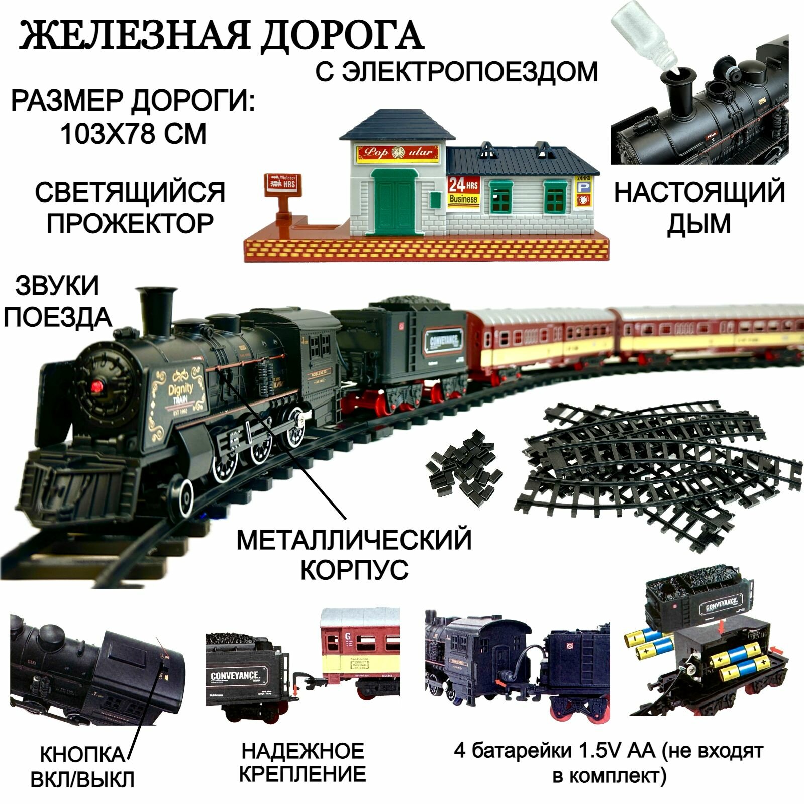 Детская железная дорога с поездом Rail King, 15 элементов, размер дороги 103х78 см, металлический поезд, 3 вагона, дым, светящийся прожектор, звук информация: