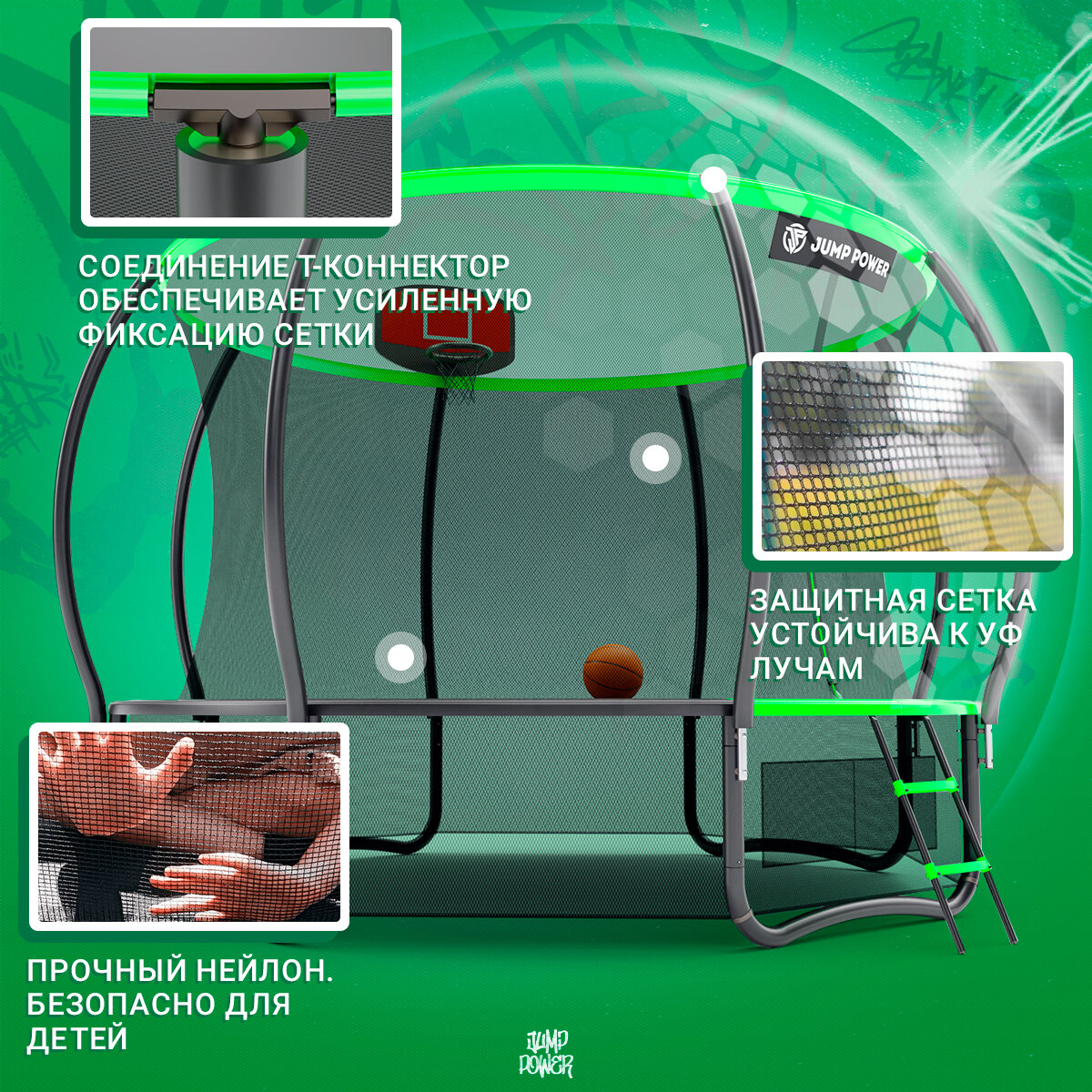 Батут каркасный детский Jump Power 306 см зеленый с защитной сеткой для детей/ игровой комплекс/баскетбольное кольцо+мяч/ максимальная нагрузка 150кг