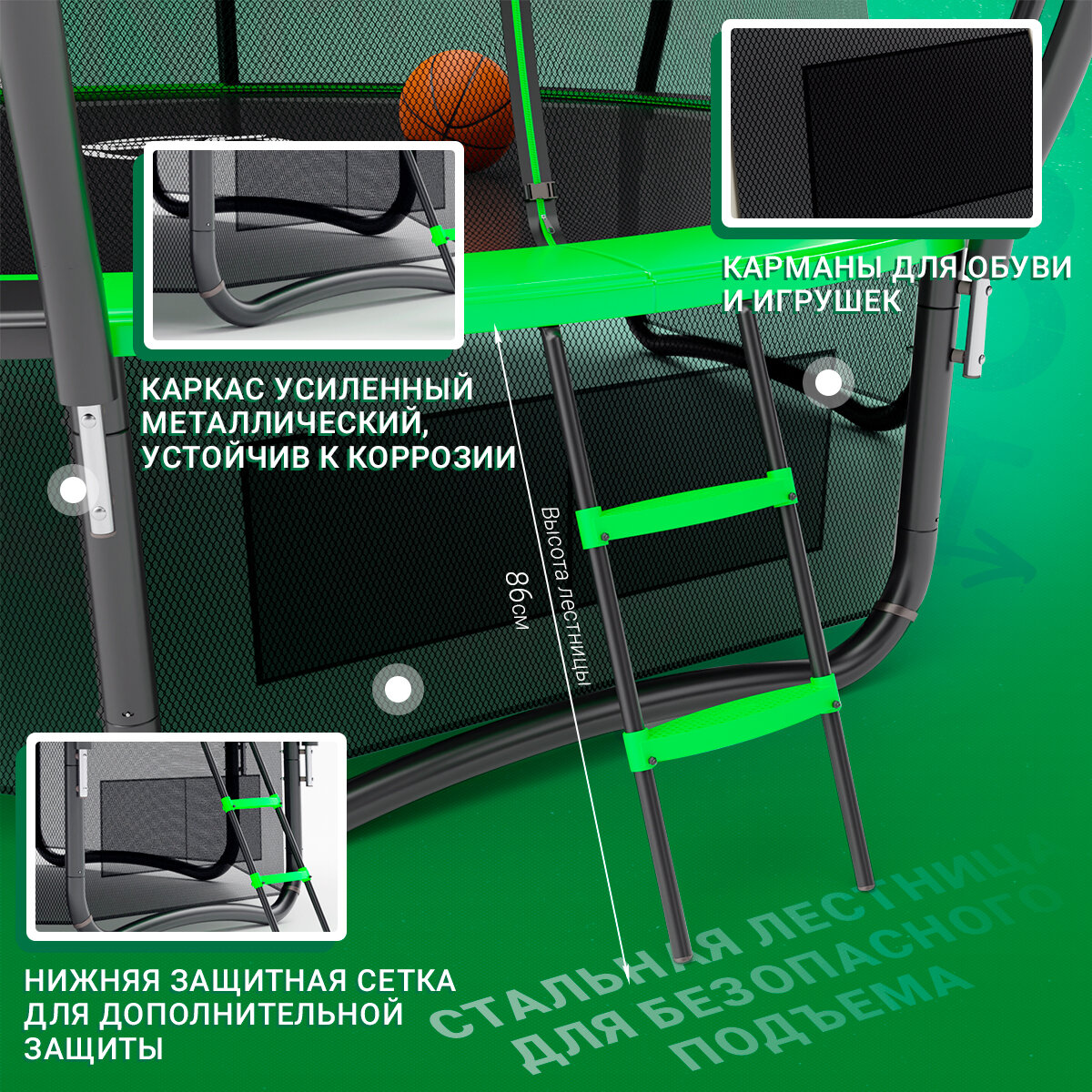 | Особенности | W-образные опоры / баскетбольное кольцо / защита пружин / нижняя защитная сетка / с защитной сеткой / с лестницей / складная конструкция |