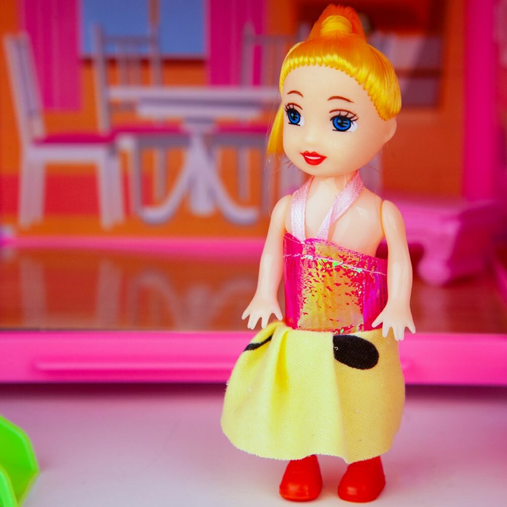 | Подробная комплектация | кукольный дом, кукла 2шт, стол 3шт, стул 3шт, горка маленькая, диван, кресло 2шт, тумба, зонтик, лампа напольная, баннер |