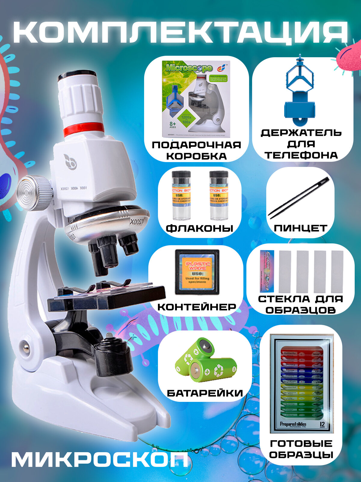 | Комплектация | Микроскоп, 12 образцов, 4 стекла для изготовления образцов, 2 баночки, 1 футляр, держатель смартфона, пинцет |