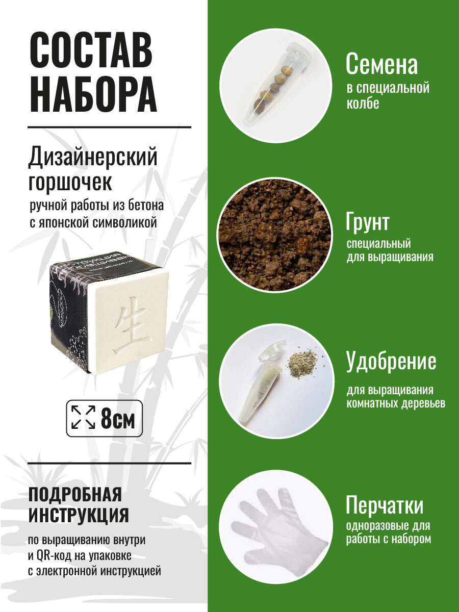 | Комплектация | подарочная коробка, кашпо из бетона, семена в защитной капсуле, умное удобрение, специальный грунт, пара одноразовых перчаток, инструкция по выращивания семян |