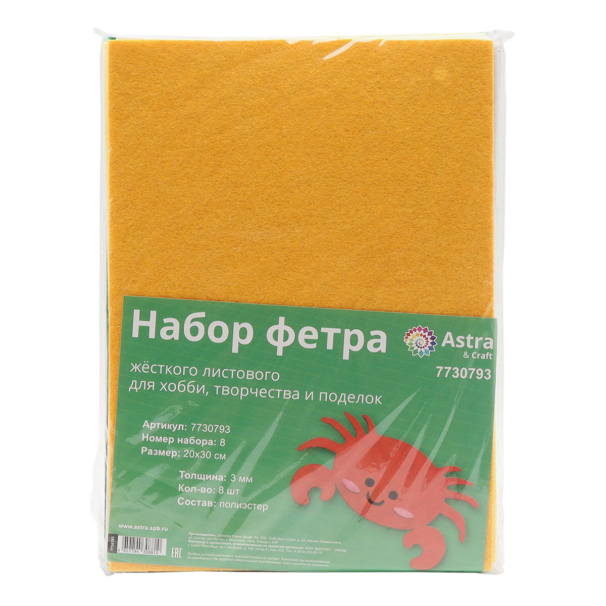 Набор фетра жесткого листового ассорти, 3 мм, 20х30 см, 8 шт, Astra&Craft (8) информация: