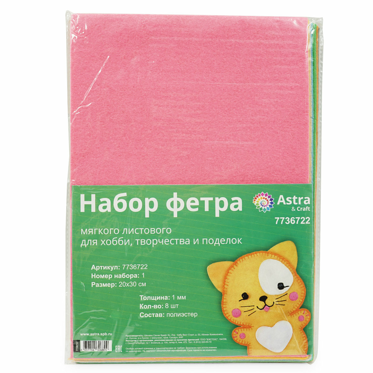 Фетр Astra&Craft Листовой мягкий, ассорти, №1, 1 мм, 170 г, 20х30 см, 8 шт информация: