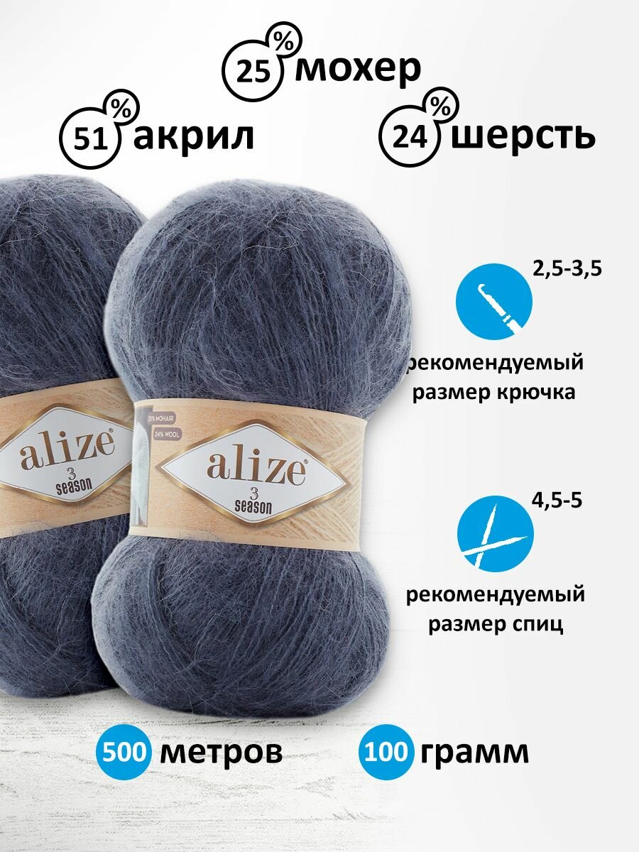 Пряжа для вязания ALIZE '3 SEASON', 100г, 500м (25% мохер, 24% шерсть, 51% акрил) (87 серо-голубой), 5 мотков информация: