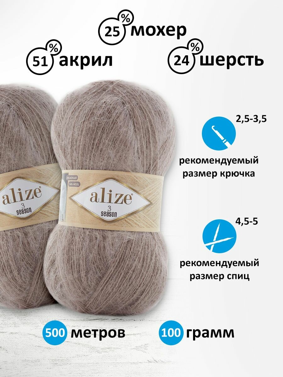 Пряжа для вязания ALIZE '3 SEASON', 100г, 500м (25% мохер, 24% шерсть, 51% акрил) (541 светло-коричневый), 5 мотков информация: