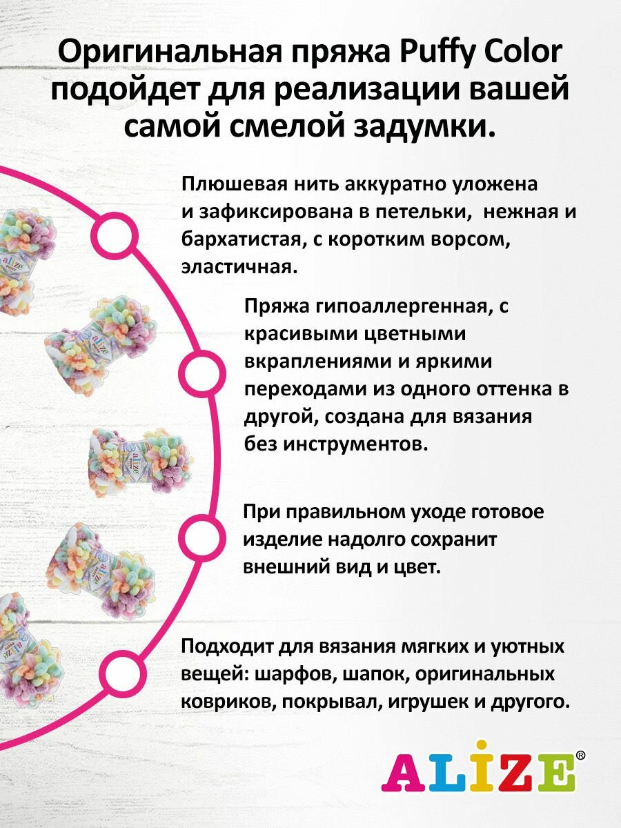 Пряжа PUFFY COLOR (Alize), сал/бир/сир/роз - 6526, 100% микрополиэстер, 5 мотков, 100 г, 9 м. 1 441 ₽
