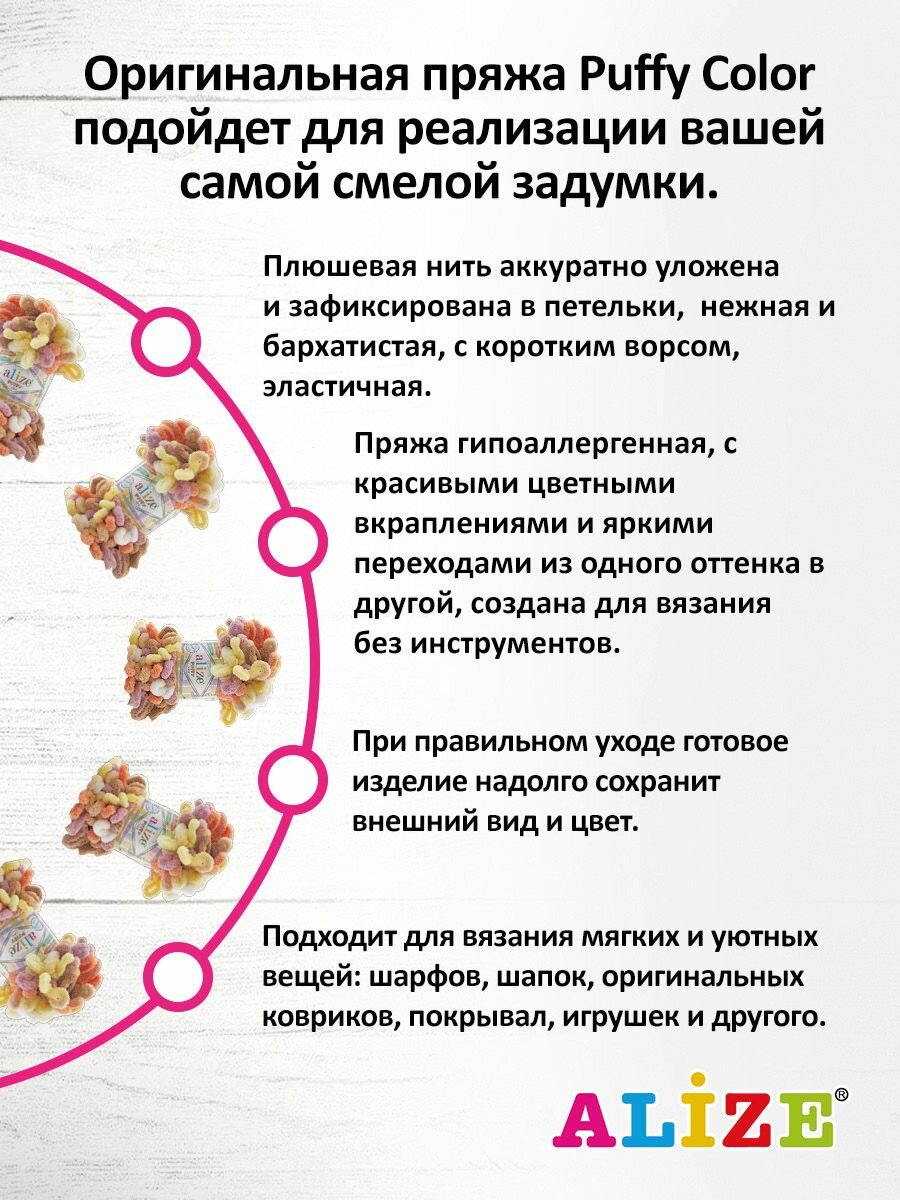 Пряжа PUFFY COLOR (Alize), сал/бир/сир/роз - 6526, 100% микрополиэстер, 5 мотков, 100 г, 9 м. 1 441 ₽