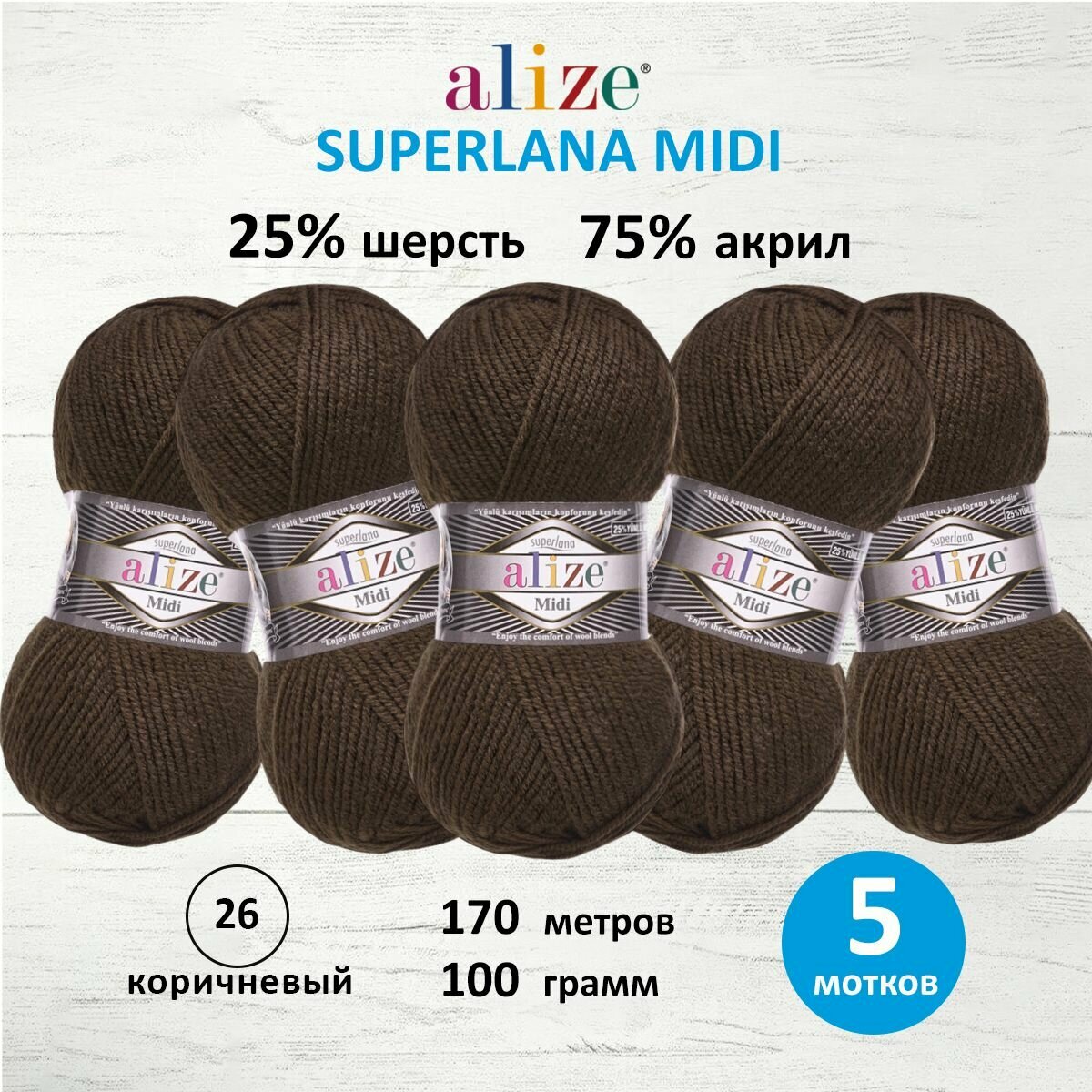 10 цен на Пряжа Alize Superlana Midi коричневывй (26), 25%шерсть/75%акрил, 170м, 100г, 5шт