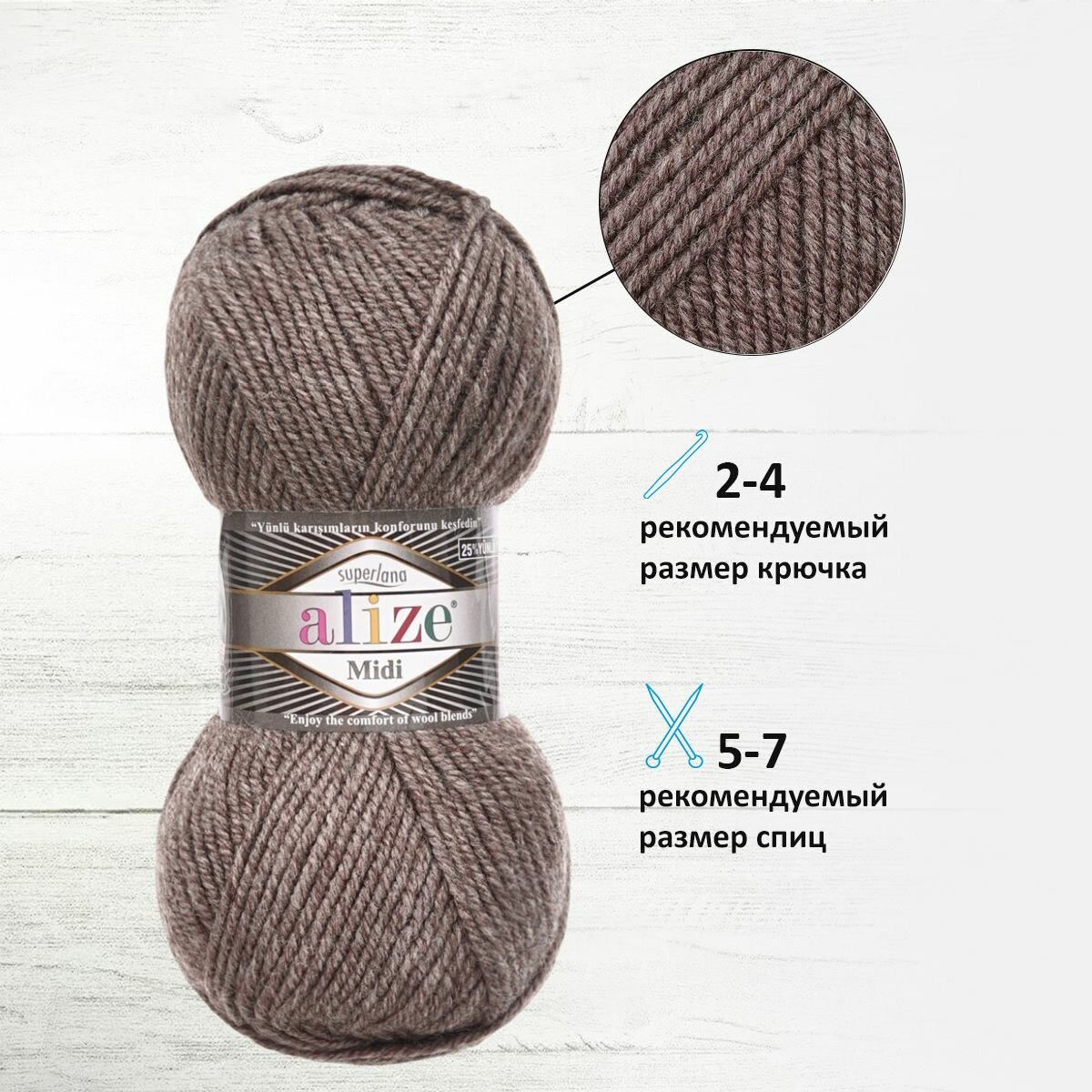 Пряжа Alize Superlana Midi кофе с молоком/меланж (207), 25%шерсть/75%акрил, 170м, 100г, 1шт