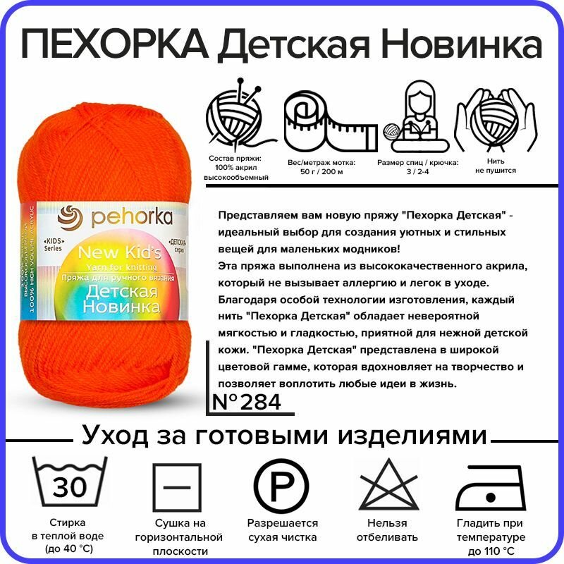 Пряжа Пехорка Детская новинка 1 моток, цвет оранжевый 284, состав 100% акрил, вес 50г, длина 200м