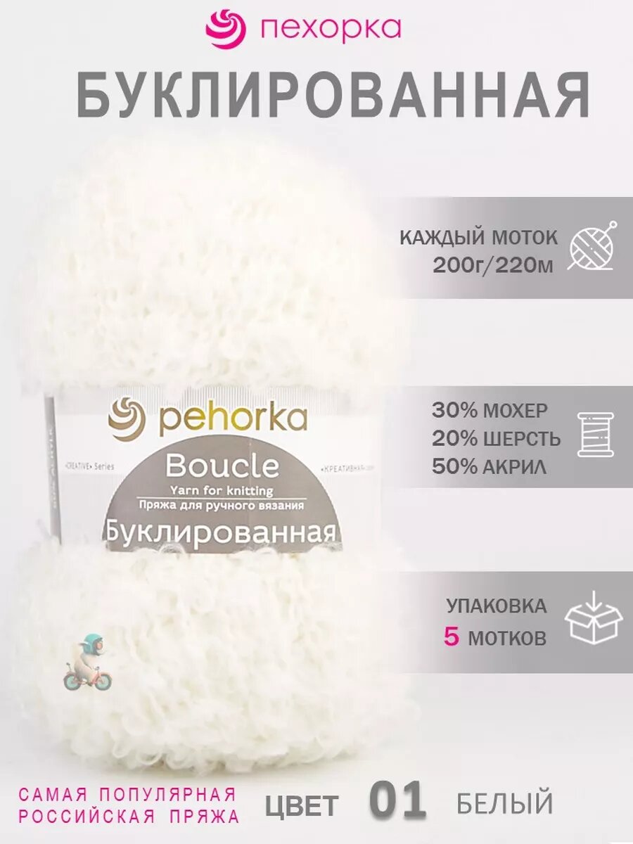 Пряжа Пехорка Буклированная цвет 01 белый (200г/220м, упаковка 5 мотков) 2 056 ₽
