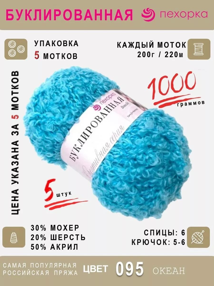 Пряжа Пехорка Буклированная цвет 95 океан (200г/220м, упаковка 5 мотков) 2 300 ₽