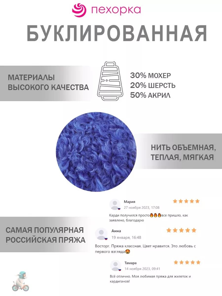 Пряжа Пехорка Буклированная василек (026), 30%мохер/20%шерсть/50%акрил, 220м, 200г, 1шт