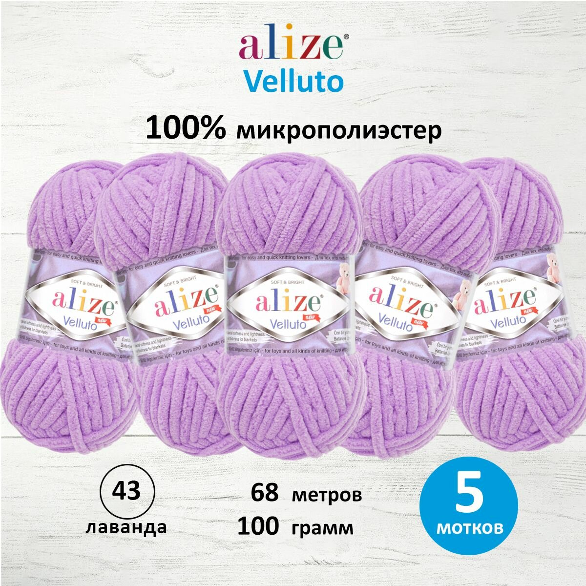 Пряжа для вязания Alize 'Velluto', 100г, 68м (100% микрополиэстер) (43 лаванда), 5 мотков 1 333 ₽