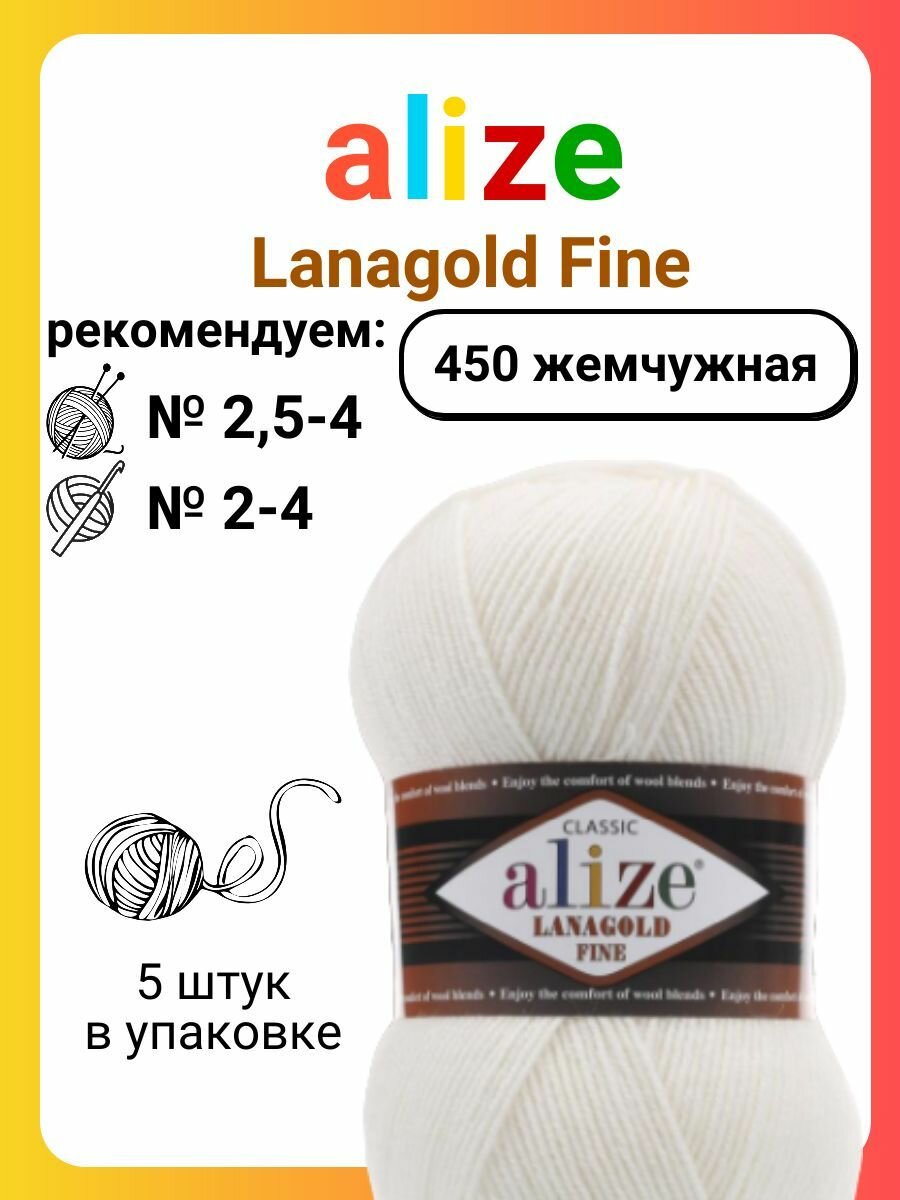10 цен на Пряжа Alize Lanagold Fine жемчужный (450), 51%акрил/49%шерсть, 390м, 100г, 5шт