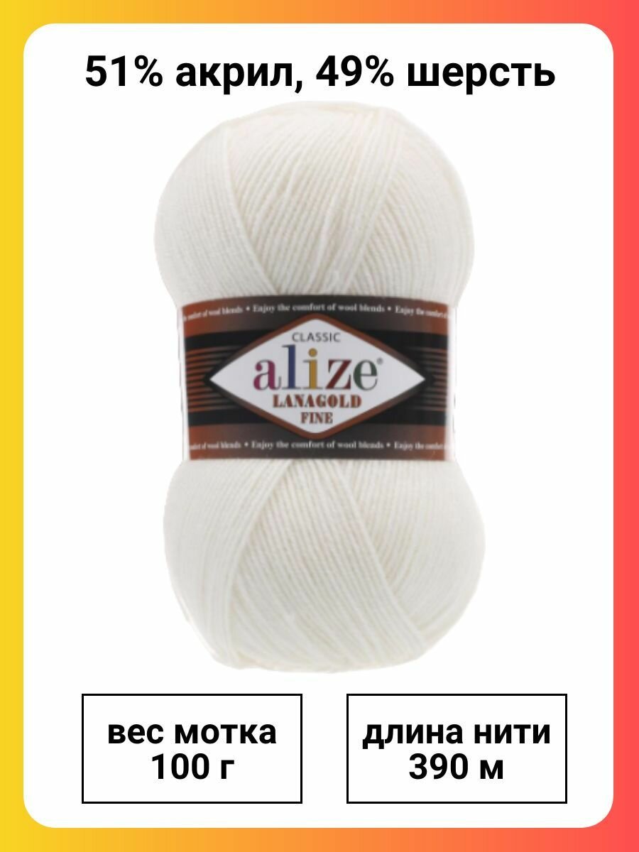 Пряжа Alize Lanagold Fine молочный (62), 51%акрил/49%шерсть, 390м, 100г, 1шт