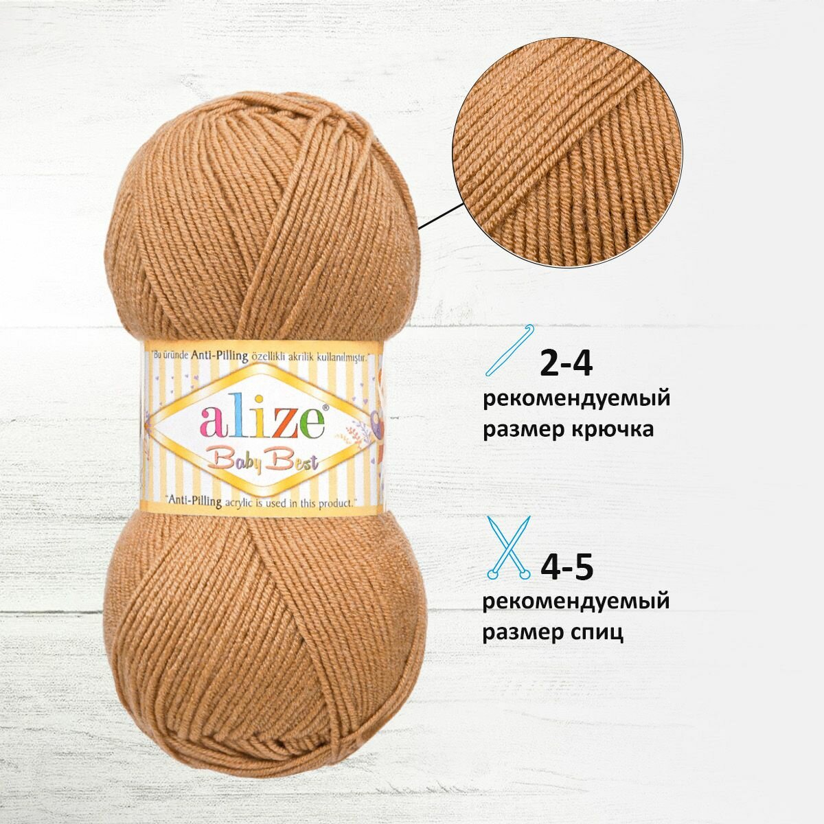 Пряжа для вязания ALIZE 'Baby Best', 100г, 240м (10% бамбук, 90% акрил) Антипиллинг (824 светло-коричневый), 5 мотков информация:
