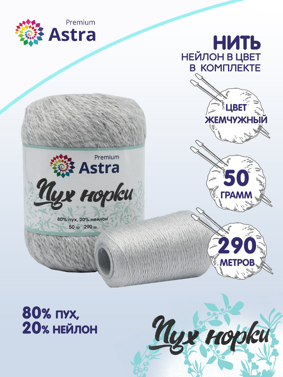 Пряжа для вязания Astra Premium 'Пух норки' (Mink yarn), 50г, 290м (80% пух, 20% нейлон) + нить 20г (02 жемчужный) информация: