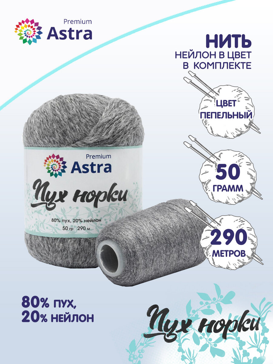 Пряжа для вязания Astra Premium 'Пух норки' (Mink yarn), 50г, 290м (80% пух, 20% нейлон) + нить 20г (047 пепельный) информация: