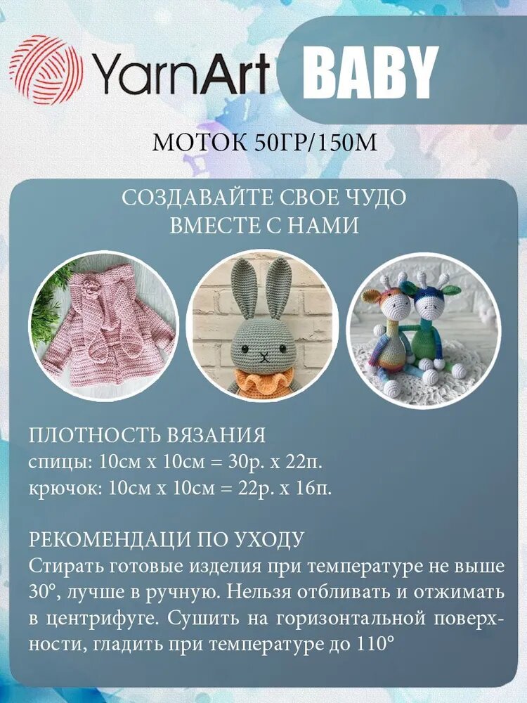 Пряжа для вязания спицами, крючком YarnArt, Baby, 100% акрил, 150 м/50 г, (501 белый) 386 ₽