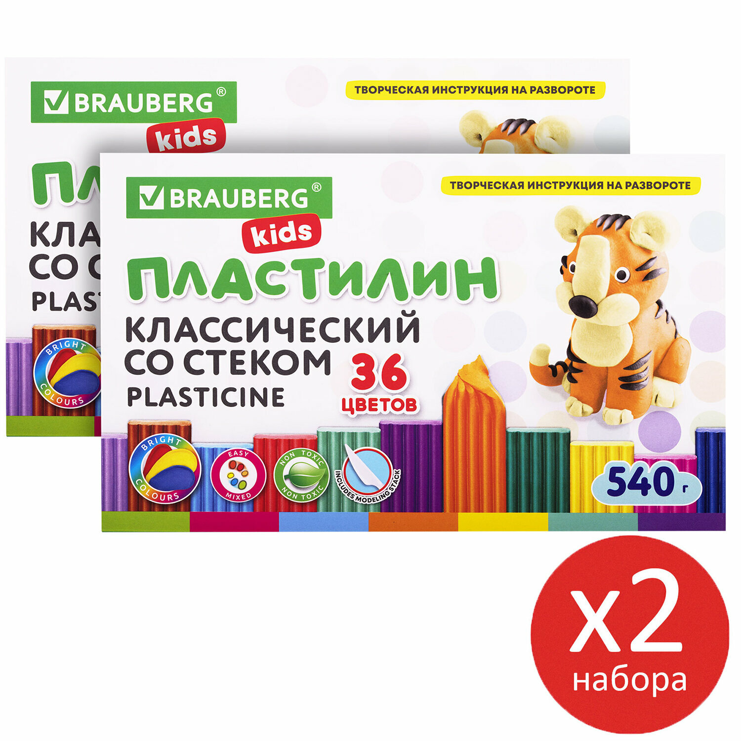 10 цен на Пластилин для лепки детский набор 2 штуки по 36 цветов большой, мягкий для малышей, классический в школу, 1080 грамм, 2 стека, Brauberg Kids, 881060