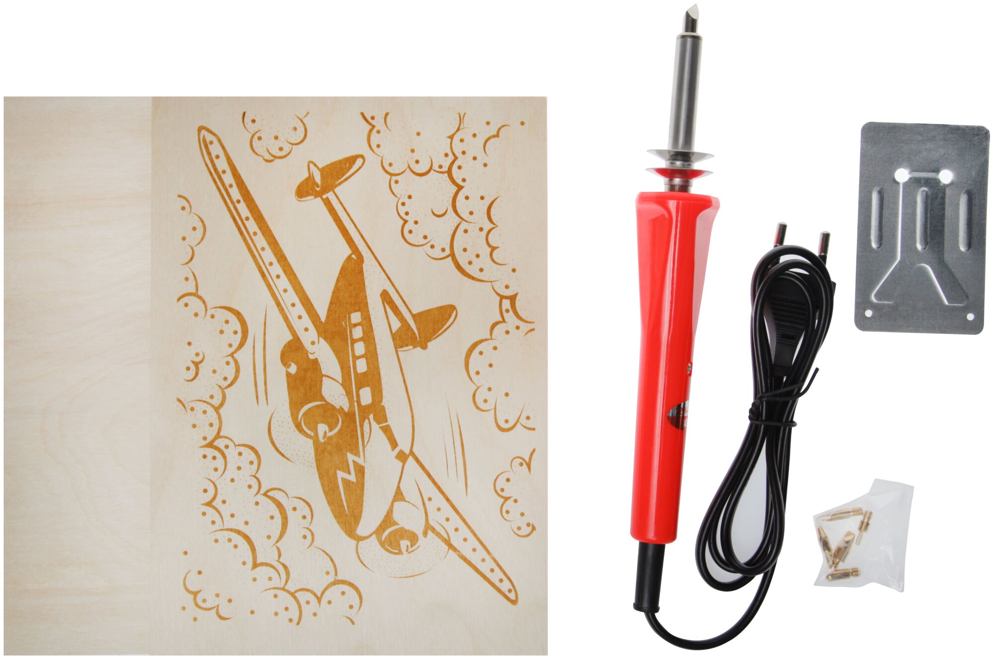 | Подробная комплектация | аппарат для выжигания по дереву (пирограф)— 1 шт. (длина прибора 23 см., длина шнура 90 см.), подставка под аппарат – 1 шт. (5х8 см.), фигурные насадки для нанесения изображений различной сложности — 5 шт. (1,6 см), доска с нанесённым рисунком самолёт - 1 шт. (21х15 см., толщина 3 мм.), доска без рисунка (пробная) – 1 шт. (21х11 см., толщина 3 мм.) |