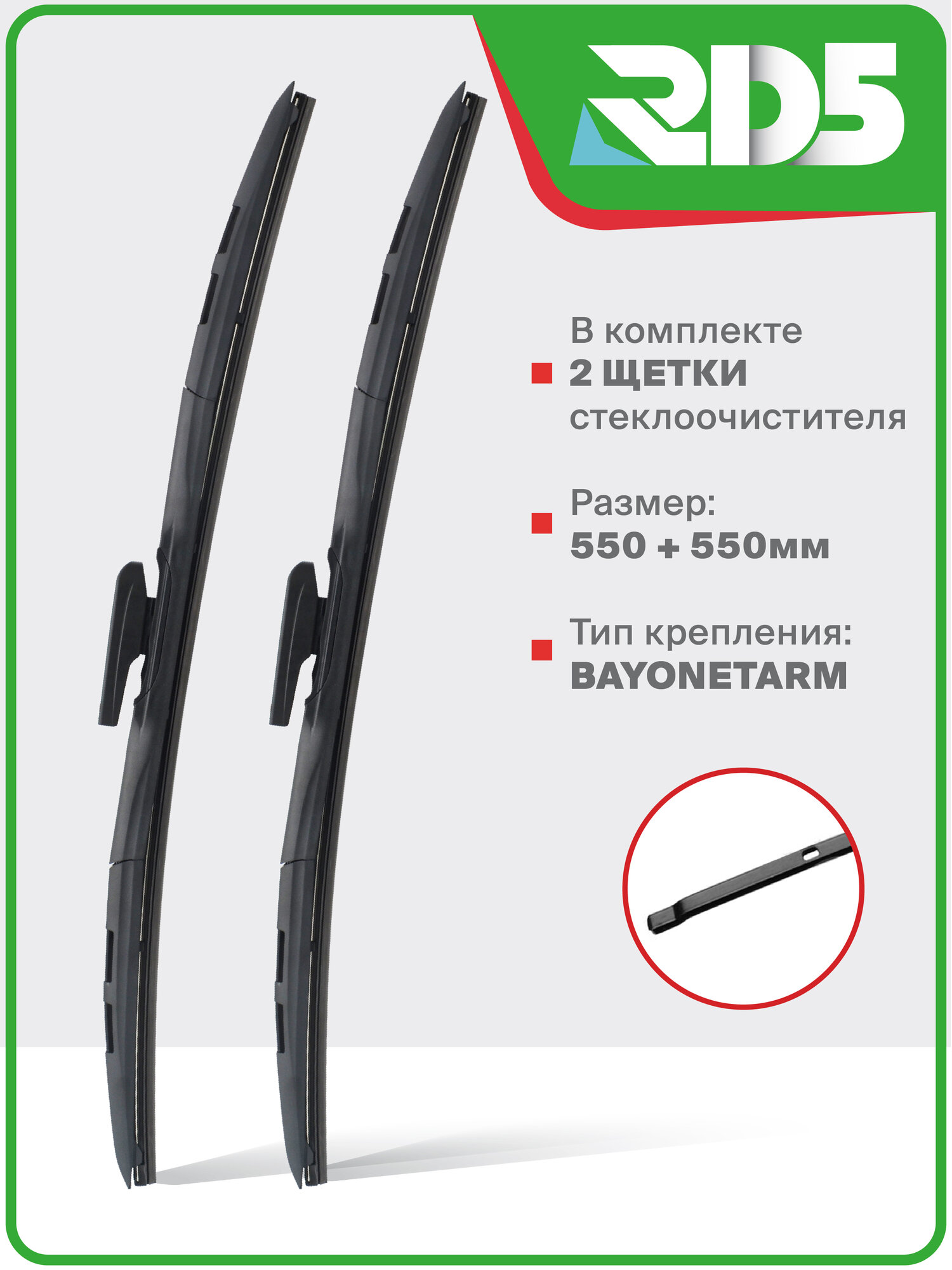 | Подробная комплектация | Комплект гибридных щеток стеклоочистителя RD5 650 500 мм. Крепление Bayonetarm |