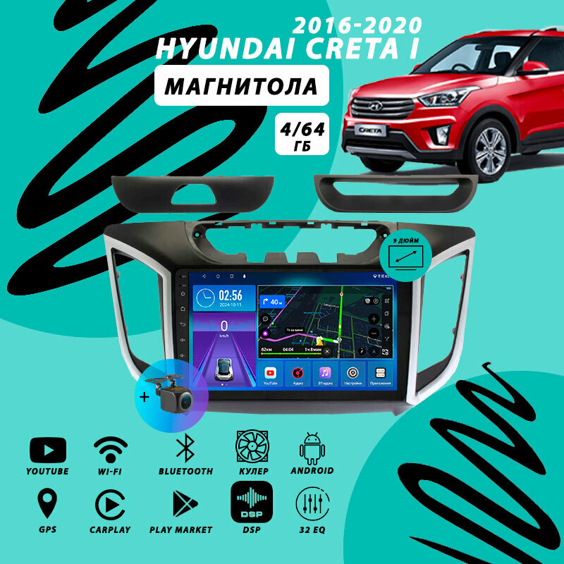 Отзывы на Магнитола Hyundai Creta (2016-2020) 9″ 4Гб+64Гб/DSP/Android/Carplay/кулер/Wi-Fi/Bluetooth/2din/штатная магнитола