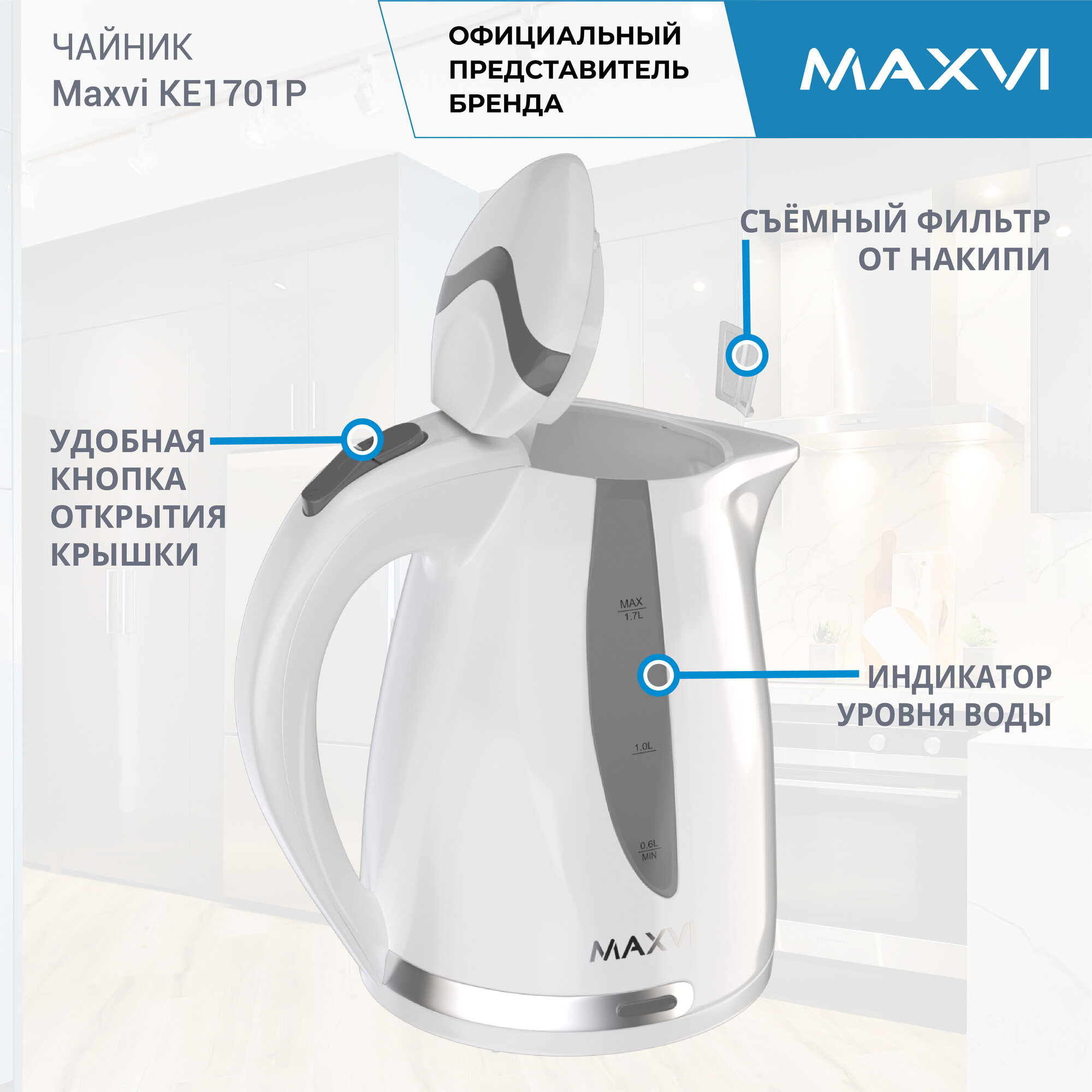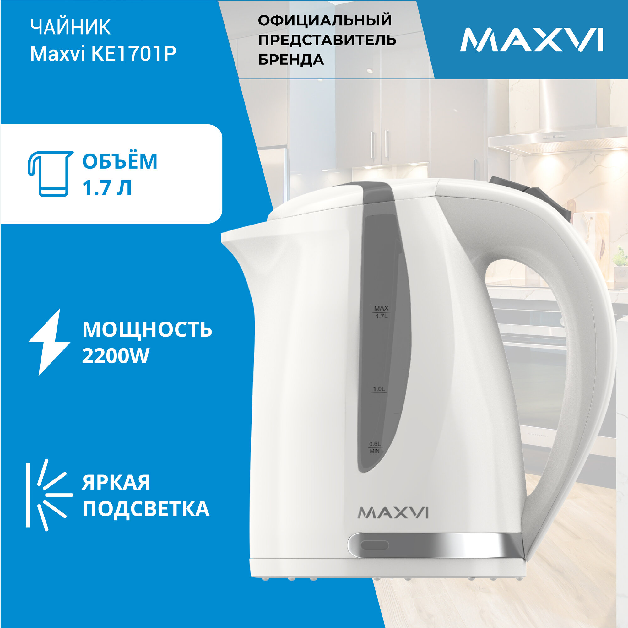 Электрический чайник MAXVI KE1701P, 1,7 литра, 2200 Вт, белый информация: