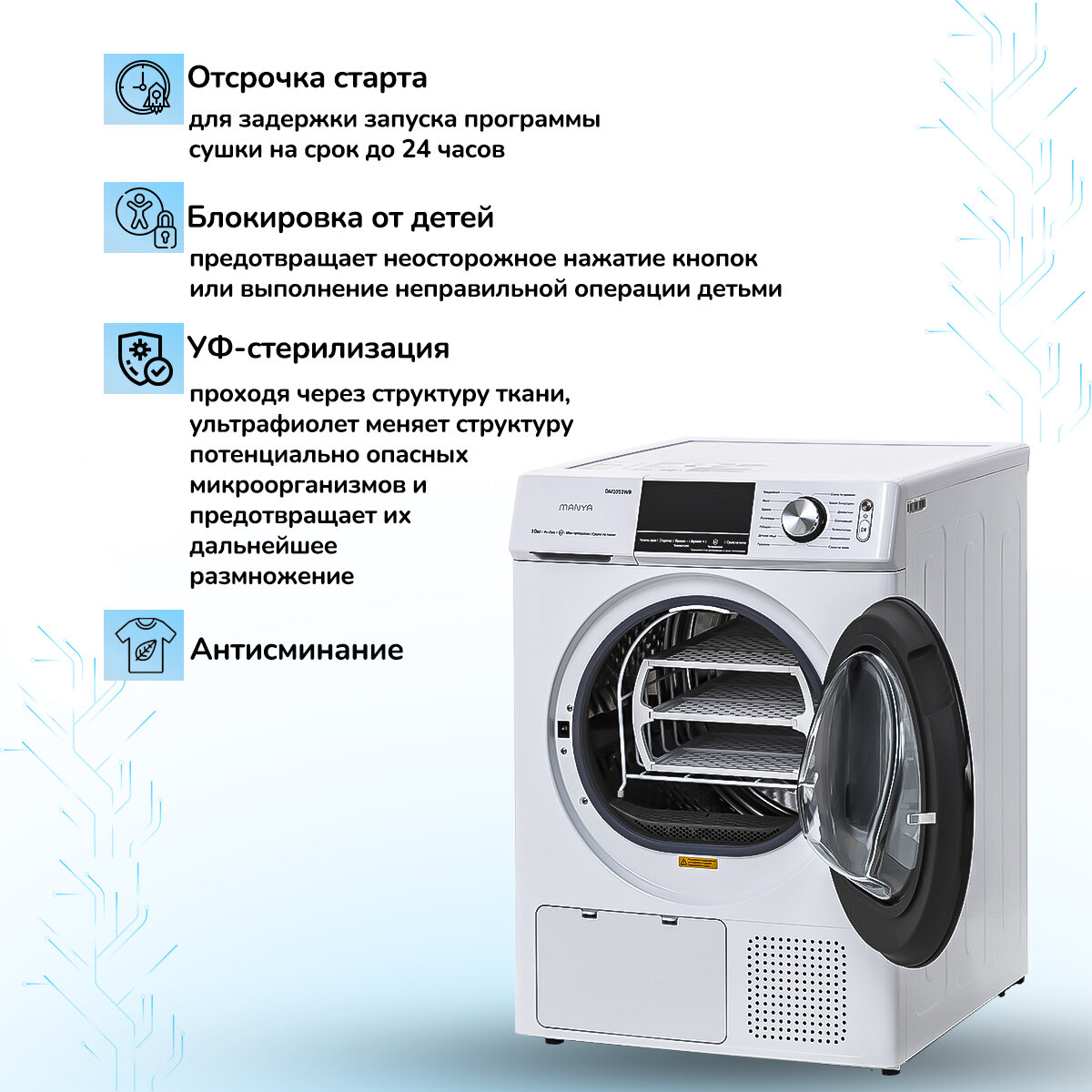 Сушильная машина MANYA DM1011WB 10кг, 14 программ, подсветка барабана, LED дисплей информация: