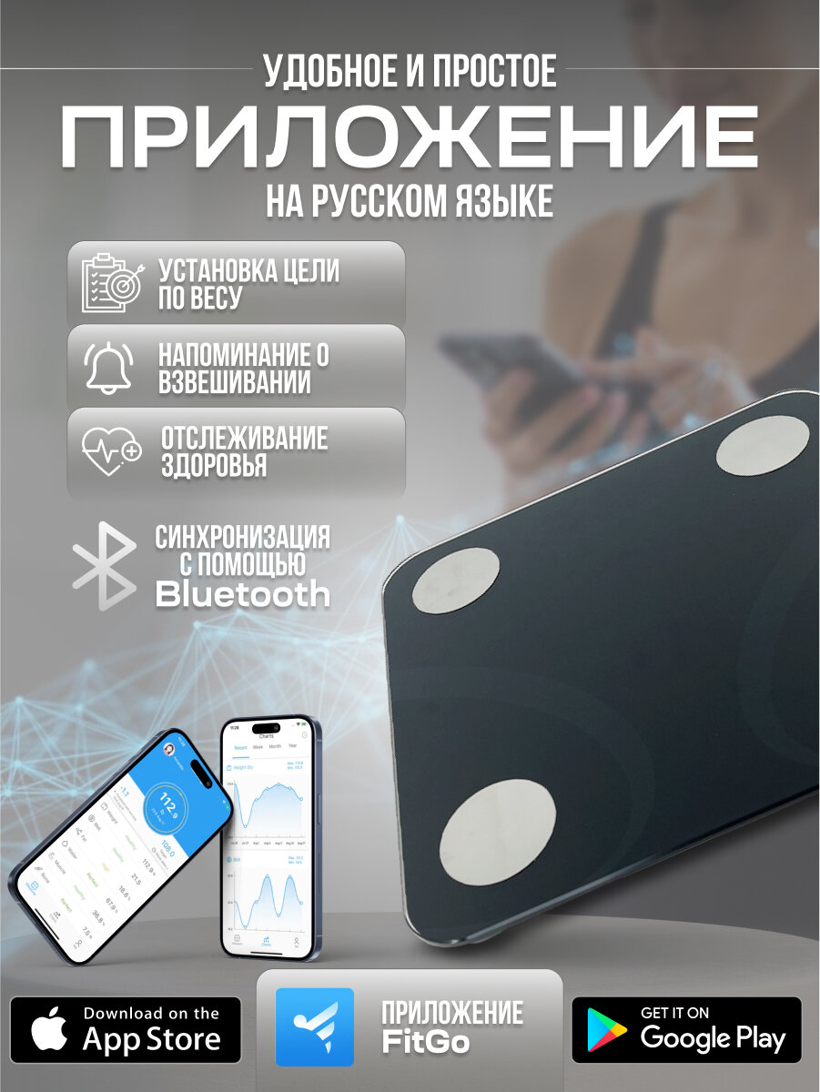 Умные весы напольные ДОМ ХИТ, синхронизация по Bluetooth, функций здоровья, высокая точность, компактный, черные информация: