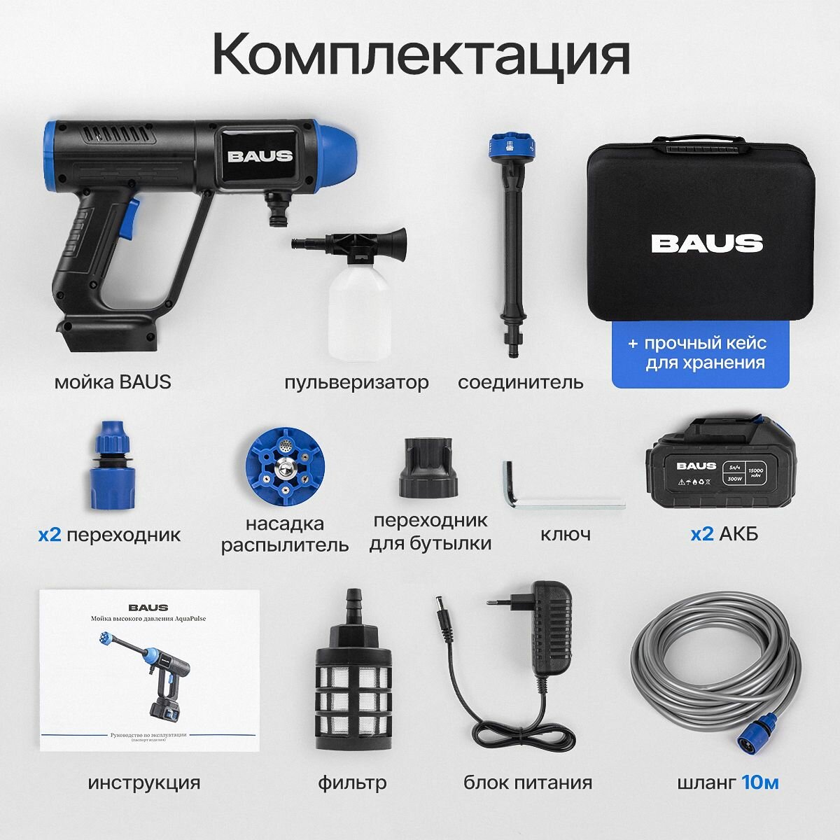 | Подробная комплектация | 1. Мойка высокого давления BAUS AquaPulse 2. Насадка распылитель 3. Носик распылителя 4. Переходний для водопроводной трубы - x2 5. Пульверизатор для автомобильного шампуня 6. Погружной фильтр тонкой очистки воды 7. Шланг подачи воды 8. Аккумулятор - x2 9. Блок питания аккумулятора 10. Кейс для хранения и переноски 11. Руководство пользователя |
