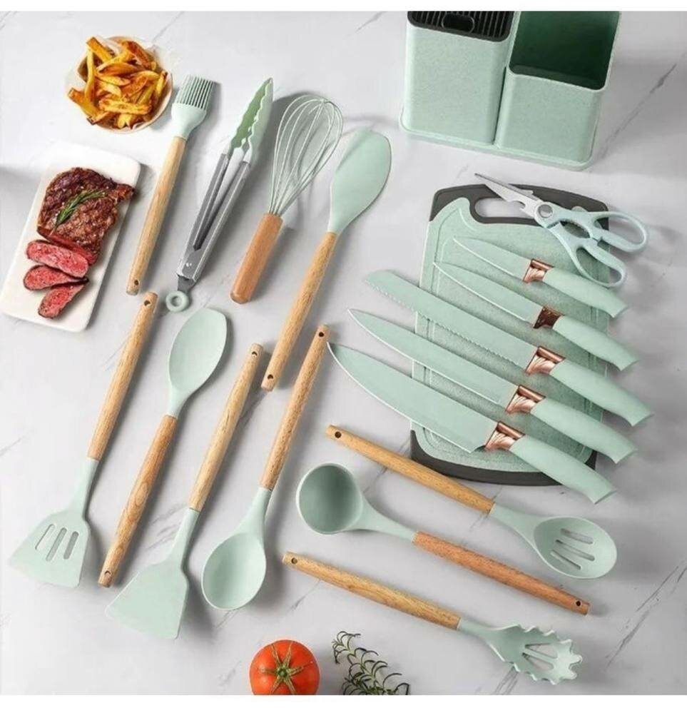 | Комплектация | Щипцы кухонные, лопатка кондитерская и лопаточка с отверстиями для жарки на сковороде, ложка для спагетти, ложка для салата, ложка для выпечки, шпатель, половник, шумовка, венчик для взбивания, кисточка для масла, 5 ножей разного размера, разделочная доска и подставка для хранения приборов. |