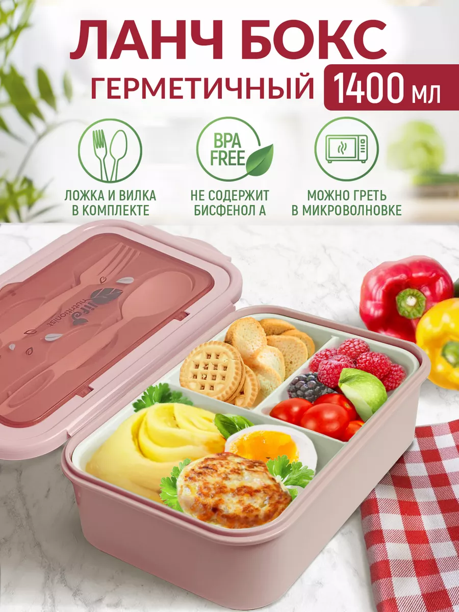 Отзывы на Ланч-бокс с отделениями и столовыми приборами 1400мл, розовый, WILKER