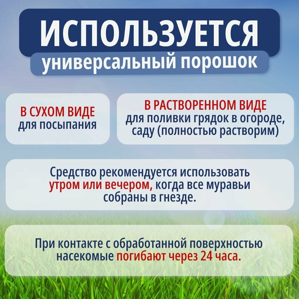 | Способ применения | в виде порошка: порошок рассыпать тонким слоем (ок. 10 г на 1 м²) на гнездо и на пути следования муравьев (т.е на муравьиных дорожках), на трещинах, щелях и швах, откуда он будет перенесен в гнездо, уничтожая колонию; в виде раствора: порошок развести в воде, тщательно помешивая, из расчета 100 г на 2,5 л воды, обработку проводить сразу после приготовления раствора; трещины, щели, швы и гнезда муравьев полить приготовленным раствором; также необходимо обработать все пути подхода к муравьиному гнезду; не обрабатывать места (пол, лестницы и т.п.) частого передвижения людей |