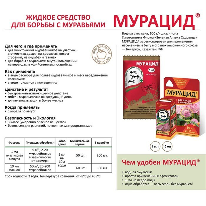 | Дополнительная информация | 1 мл ампула - 5 кв. м, 2-20 муравейников; 10 мл флакон - 25 кв. м, 10-200 муравейников; 3 класс (умеренно опасное вещество); безопасен для растений, почвенных микроорганизмов |