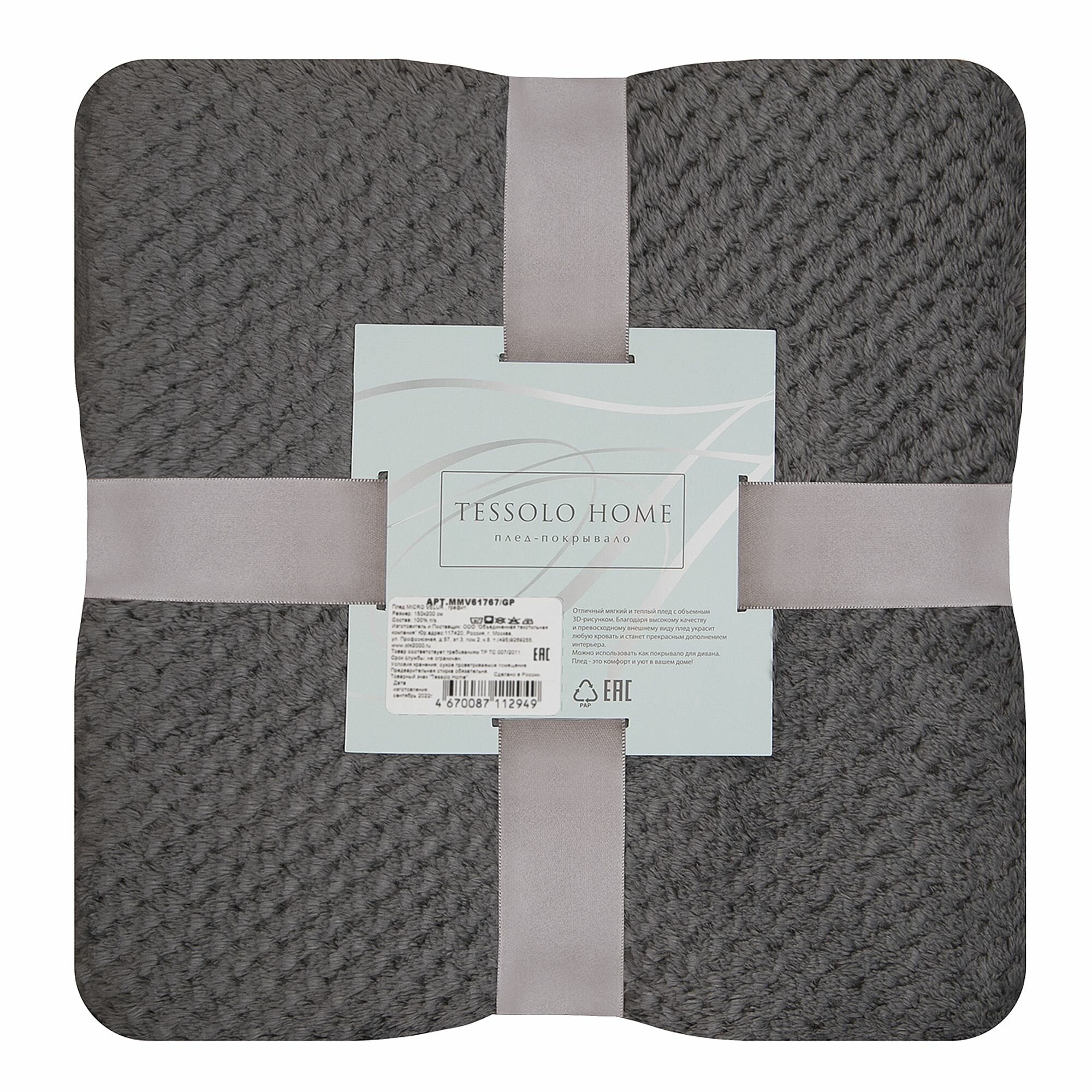 Плед 150Х200 см на кровать или диван. Плюшевый и мягкий "Жаккард" серый 1 580 ₽