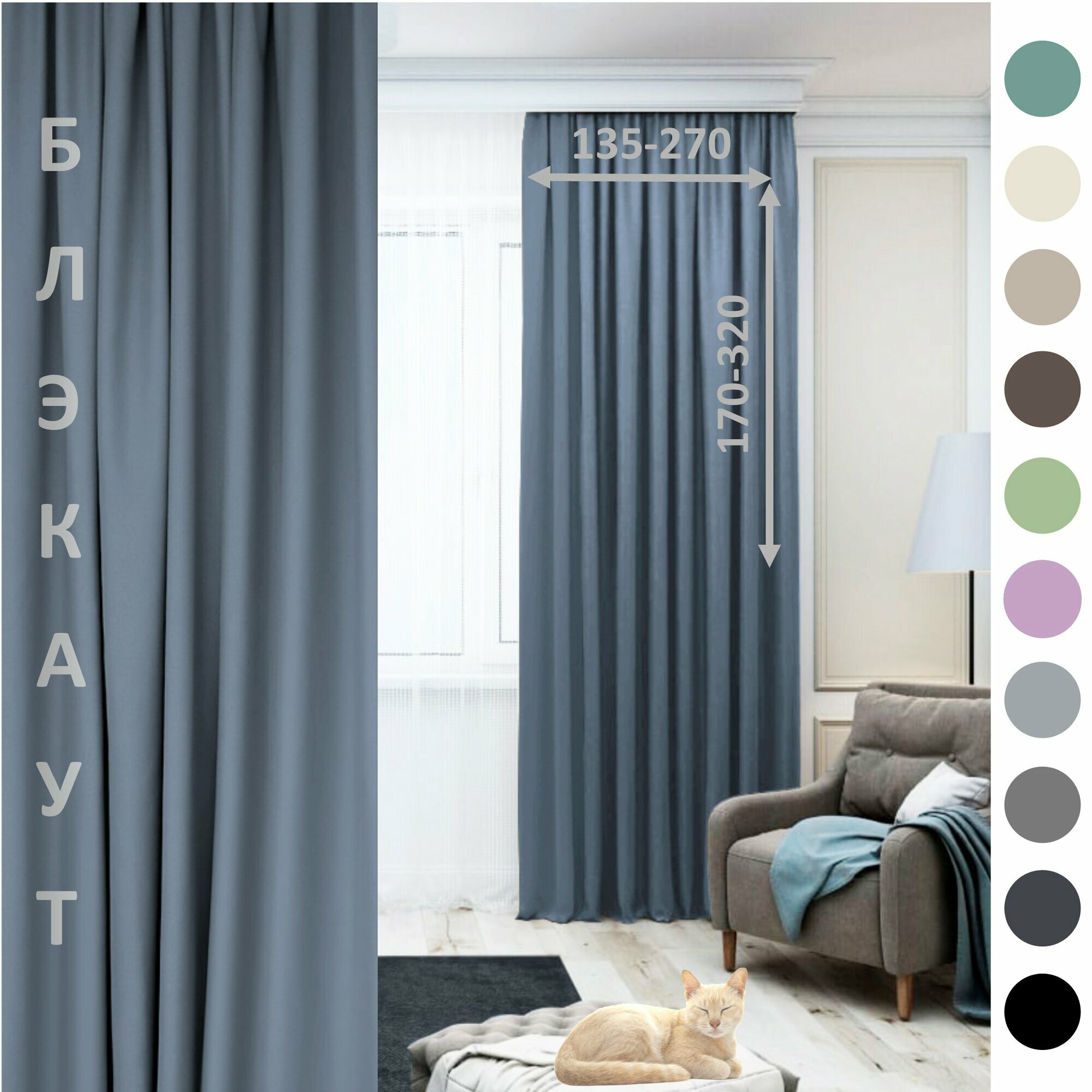 Штора светозащитная для комнаты и спальни "Блэкаут матовый голубой" 270x300 на ленте 3 390 ₽