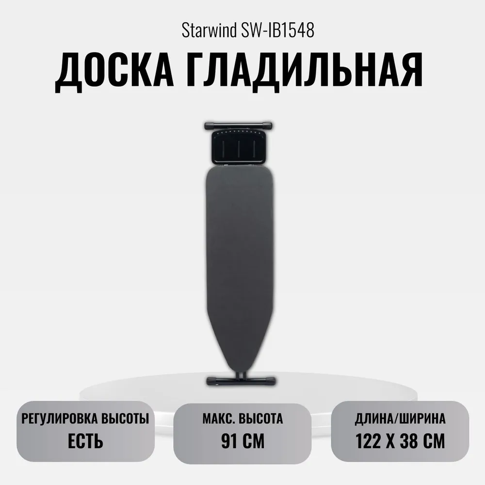 Доска гладильная Starwind, IB1548 черная, 122x38 см, хлопковый чехол, с подставкой под утюг, регулируемая высота ножек информация: